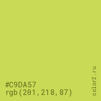Цвет #C9DA57 в цветовой модели RGB обозначается тремя октетами (201, 218, 87) в десятичном формате и #C9DA57 в шестнадцатиричном (hex) формате, которые являются интенсивностью красного 201 (hex C9), интенсивность зелёного 218 (hex DA) и интенсивность синего 87 (hex 57).