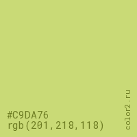 Цвет #C9DA76 в цветовой модели RGB обозначается тремя октетами (201, 218, 118) в десятичном формате и #C9DA76 в шестнадцатиричном (hex) формате, которые являются интенсивностью красного 201 (hex C9), интенсивность зелёного 218 (hex DA) и интенсивность синего 118 (hex 76).
