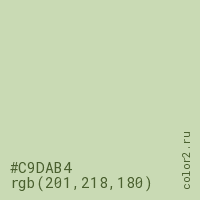 Цвет #C9DAB4 в цветовой модели RGB обозначается тремя октетами (201, 218, 180) в десятичном формате и #C9DAB4 в шестнадцатиричном (hex) формате, которые являются интенсивностью красного 201 (hex C9), интенсивность зелёного 218 (hex DA) и интенсивность синего 180 (hex B4).