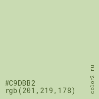 Цвет #C9DBB2 в цветовой модели RGB обозначается тремя октетами (201, 219, 178) в десятичном формате и #C9DBB2 в шестнадцатиричном (hex) формате, которые являются интенсивностью красного 201 (hex C9), интенсивность зелёного 219 (hex DB) и интенсивность синего 178 (hex B2).