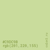 Цвет #C9DC9B в цветовой модели RGB обозначается тремя октетами (201, 220, 155) в десятичном формате и #C9DC9B в шестнадцатиричном (hex) формате, которые являются интенсивностью красного 201 (hex C9), интенсивность зелёного 220 (hex DC) и интенсивность синего 155 (hex 9B).