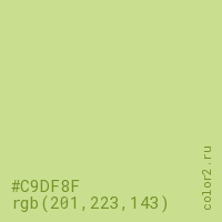 Цвет #C9DF8F в цветовой модели RGB обозначается тремя октетами (201, 223, 143) в десятичном формате и #C9DF8F в шестнадцатиричном (hex) формате, которые являются интенсивностью красного 201 (hex C9), интенсивность зелёного 223 (hex DF) и интенсивность синего 143 (hex 8F).