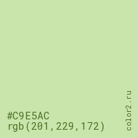 Цвет #C9E5AC в цветовой модели RGB обозначается тремя октетами (201, 229, 172) в десятичном формате и #C9E5AC в шестнадцатиричном (hex) формате, которые являются интенсивностью красного 201 (hex C9), интенсивность зелёного 229 (hex E5) и интенсивность синего 172 (hex AC).