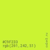 Цвет #C9F233 в цветовой модели RGB обозначается тремя октетами (201, 242, 51) в десятичном формате и #C9F233 в шестнадцатиричном (hex) формате, которые являются интенсивностью красного 201 (hex C9), интенсивность зелёного 242 (hex F2) и интенсивность синего 51 (hex 33).