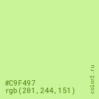 Цвет #C9F497 в цветовой модели RGB обозначается тремя октетами (201, 244, 151) в десятичном формате и #C9F497 в шестнадцатиричном (hex) формате, которые являются интенсивностью красного 201 (hex C9), интенсивность зелёного 244 (hex F4) и интенсивность синего 151 (hex 97).