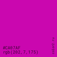 Цвет #CA07AF в цветовой модели RGB обозначается тремя октетами (202, 7, 175) в десятичном формате и #CA07AF в шестнадцатиричном (hex) формате, которые являются интенсивностью красного 202 (hex CA), интенсивность зелёного 7 (hex 07) и интенсивность синего 175 (hex AF).