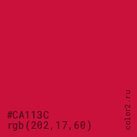 Цвет #CA113C в цветовой модели RGB обозначается тремя октетами (202, 17, 60) в десятичном формате и #CA113C в шестнадцатиричном (hex) формате, которые являются интенсивностью красного 202 (hex CA), интенсивность зелёного 17 (hex 11) и интенсивность синего 60 (hex 3C).