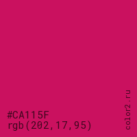Цвет #CA115F в цветовой модели RGB обозначается тремя октетами (202, 17, 95) в десятичном формате и #CA115F в шестнадцатиричном (hex) формате, которые являются интенсивностью красного 202 (hex CA), интенсивность зелёного 17 (hex 11) и интенсивность синего 95 (hex 5F).
