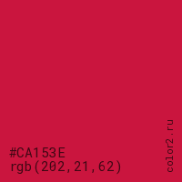 Цвет #CA153E в цветовой модели RGB обозначается тремя октетами (202, 21, 62) в десятичном формате и #CA153E в шестнадцатиричном (hex) формате, которые являются интенсивностью красного 202 (hex CA), интенсивность зелёного 21 (hex 15) и интенсивность синего 62 (hex 3E).