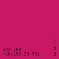 Цвет #CA1763 в цветовой модели RGB обозначается тремя октетами (202, 23, 99) в десятичном формате и #CA1763 в шестнадцатиричном (hex) формате, которые являются интенсивностью красного 202 (hex CA), интенсивность зелёного 23 (hex 17) и интенсивность синего 99 (hex 63).
