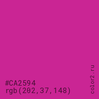 Цвет #CA2594 в цветовой модели RGB обозначается тремя октетами (202, 37, 148) в десятичном формате и #CA2594 в шестнадцатиричном (hex) формате, которые являются интенсивностью красного 202 (hex CA), интенсивность зелёного 37 (hex 25) и интенсивность синего 148 (hex 94).