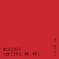 Цвет #CA2831 в цветовой модели RGB обозначается тремя октетами (202, 40, 49) в десятичном формате и #CA2831 в шестнадцатиричном (hex) формате, которые являются интенсивностью красного 202 (hex CA), интенсивность зелёного 40 (hex 28) и интенсивность синего 49 (hex 31).