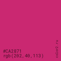Цвет #CA2871 в цветовой модели RGB обозначается тремя октетами (202, 40, 113) в десятичном формате и #CA2871 в шестнадцатиричном (hex) формате, которые являются интенсивностью красного 202 (hex CA), интенсивность зелёного 40 (hex 28) и интенсивность синего 113 (hex 71).