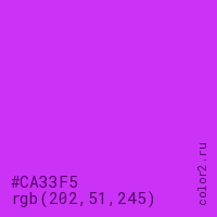 Цвет #CA33F5 в цветовой модели RGB обозначается тремя октетами (202, 51, 245) в десятичном формате и #CA33F5 в шестнадцатиричном (hex) формате, которые являются интенсивностью красного 202 (hex CA), интенсивность зелёного 51 (hex 33) и интенсивность синего 245 (hex F5).