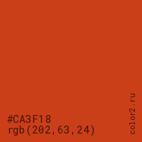 Цвет #CA3F18 в цветовой модели RGB обозначается тремя октетами (202, 63, 24) в десятичном формате и #CA3F18 в шестнадцатиричном (hex) формате, которые являются интенсивностью красного 202 (hex CA), интенсивность зелёного 63 (hex 3F) и интенсивность синего 24 (hex 18).