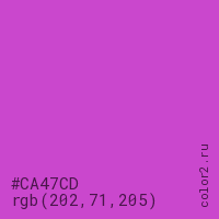 Цвет #CA47CD в цветовой модели RGB обозначается тремя октетами (202, 71, 205) в десятичном формате и #CA47CD в шестнадцатиричном (hex) формате, которые являются интенсивностью красного 202 (hex CA), интенсивность зелёного 71 (hex 47) и интенсивность синего 205 (hex CD).