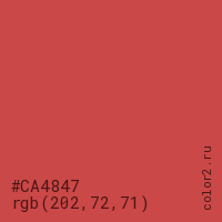 Цвет #CA4847 в цветовой модели RGB обозначается тремя октетами (202, 72, 71) в десятичном формате и #CA4847 в шестнадцатиричном (hex) формате, которые являются интенсивностью красного 202 (hex CA), интенсивность зелёного 72 (hex 48) и интенсивность синего 71 (hex 47).