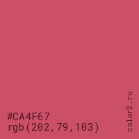 Цвет #CA4F67 в цветовой модели RGB обозначается тремя октетами (202, 79, 103) в десятичном формате и #CA4F67 в шестнадцатиричном (hex) формате, которые являются интенсивностью красного 202 (hex CA), интенсивность зелёного 79 (hex 4F) и интенсивность синего 103 (hex 67).