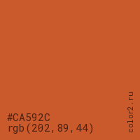 Цвет #CA592C в цветовой модели RGB обозначается тремя октетами (202, 89, 44) в десятичном формате и #CA592C в шестнадцатиричном (hex) формате, которые являются интенсивностью красного 202 (hex CA), интенсивность зелёного 89 (hex 59) и интенсивность синего 44 (hex 2C).