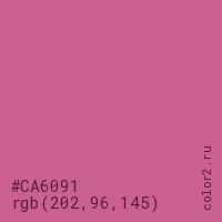 Цвет #CA6091 в цветовой модели RGB обозначается тремя октетами (202, 96, 145) в десятичном формате и #CA6091 в шестнадцатиричном (hex) формате, которые являются интенсивностью красного 202 (hex CA), интенсивность зелёного 96 (hex 60) и интенсивность синего 145 (hex 91).