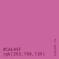 Цвет #CA649F в цветовой модели RGB обозначается тремя октетами (202, 100, 159) в десятичном формате и #CA649F в шестнадцатиричном (hex) формате, которые являются интенсивностью красного 202 (hex CA), интенсивность зелёного 100 (hex 64) и интенсивность синего 159 (hex 9F).