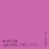 Цвет #CA67AB в цветовой модели RGB обозначается тремя октетами (202, 103, 171) в десятичном формате и #CA67AB в шестнадцатиричном (hex) формате, которые являются интенсивностью красного 202 (hex CA), интенсивность зелёного 103 (hex 67) и интенсивность синего 171 (hex AB).