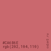 Цвет #CA686E в цветовой модели RGB обозначается тремя октетами (202, 104, 110) в десятичном формате и #CA686E в шестнадцатиричном (hex) формате, которые являются интенсивностью красного 202 (hex CA), интенсивность зелёного 104 (hex 68) и интенсивность синего 110 (hex 6E).