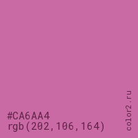 Цвет #CA6AA4 в цветовой модели RGB обозначается тремя октетами (202, 106, 164) в десятичном формате и #CA6AA4 в шестнадцатиричном (hex) формате, которые являются интенсивностью красного 202 (hex CA), интенсивность зелёного 106 (hex 6A) и интенсивность синего 164 (hex A4).