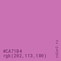 Цвет #CA71B4 в цветовой модели RGB обозначается тремя октетами (202, 113, 180) в десятичном формате и #CA71B4 в шестнадцатиричном (hex) формате, которые являются интенсивностью красного 202 (hex CA), интенсивность зелёного 113 (hex 71) и интенсивность синего 180 (hex B4).