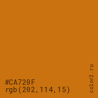 Цвет #CA720F в цветовой модели RGB обозначается тремя октетами (202, 114, 15) в десятичном формате и #CA720F в шестнадцатиричном (hex) формате, которые являются интенсивностью красного 202 (hex CA), интенсивность зелёного 114 (hex 72) и интенсивность синего 15 (hex 0F).