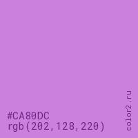 Цвет #CA80DC в цветовой модели RGB обозначается тремя октетами (202, 128, 220) в десятичном формате и #CA80DC в шестнадцатиричном (hex) формате, которые являются интенсивностью красного 202 (hex CA), интенсивность зелёного 128 (hex 80) и интенсивность синего 220 (hex DC).