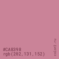 Цвет #CA8398 в цветовой модели RGB обозначается тремя октетами (202, 131, 152) в десятичном формате и #CA8398 в шестнадцатиричном (hex) формате, которые являются интенсивностью красного 202 (hex CA), интенсивность зелёного 131 (hex 83) и интенсивность синего 152 (hex 98).