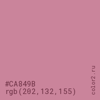 Цвет #CA849B в цветовой модели RGB обозначается тремя октетами (202, 132, 155) в десятичном формате и #CA849B в шестнадцатиричном (hex) формате, которые являются интенсивностью красного 202 (hex CA), интенсивность зелёного 132 (hex 84) и интенсивность синего 155 (hex 9B).