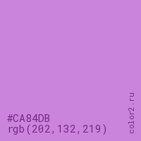 Цвет #CA84DB в цветовой модели RGB обозначается тремя октетами (202, 132, 219) в десятичном формате и #CA84DB в шестнадцатиричном (hex) формате, которые являются интенсивностью красного 202 (hex CA), интенсивность зелёного 132 (hex 84) и интенсивность синего 219 (hex DB).