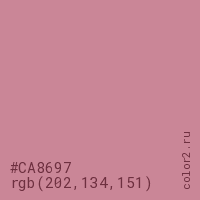 Цвет #CA8697 в цветовой модели RGB обозначается тремя октетами (202, 134, 151) в десятичном формате и #CA8697 в шестнадцатиричном (hex) формате, которые являются интенсивностью красного 202 (hex CA), интенсивность зелёного 134 (hex 86) и интенсивность синего 151 (hex 97).
