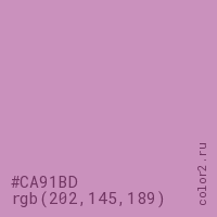 Цвет #CA91BD в цветовой модели RGB обозначается тремя октетами (202, 145, 189) в десятичном формате и #CA91BD в шестнадцатиричном (hex) формате, которые являются интенсивностью красного 202 (hex CA), интенсивность зелёного 145 (hex 91) и интенсивность синего 189 (hex BD).