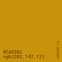Цвет #CA930C в цветовой модели RGB обозначается тремя октетами (202, 147, 12) в десятичном формате и #CA930C в шестнадцатиричном (hex) формате, которые являются интенсивностью красного 202 (hex CA), интенсивность зелёного 147 (hex 93) и интенсивность синего 12 (hex 0C).