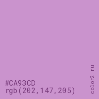 Цвет #CA93CD в цветовой модели RGB обозначается тремя октетами (202, 147, 205) в десятичном формате и #CA93CD в шестнадцатиричном (hex) формате, которые являются интенсивностью красного 202 (hex CA), интенсивность зелёного 147 (hex 93) и интенсивность синего 205 (hex CD).
