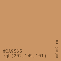 Цвет #CA9565 в цветовой модели RGB обозначается тремя октетами (202, 149, 101) в десятичном формате и #CA9565 в шестнадцатиричном (hex) формате, которые являются интенсивностью красного 202 (hex CA), интенсивность зелёного 149 (hex 95) и интенсивность синего 101 (hex 65).