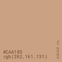 Цвет #CAA183 в цветовой модели RGB обозначается тремя октетами (202, 161, 131) в десятичном формате и #CAA183 в шестнадцатиричном (hex) формате, которые являются интенсивностью красного 202 (hex CA), интенсивность зелёного 161 (hex A1) и интенсивность синего 131 (hex 83).