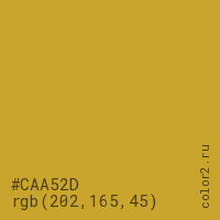 Цвет #CAA52D в цветовой модели RGB обозначается тремя октетами (202, 165, 45) в десятичном формате и #CAA52D в шестнадцатиричном (hex) формате, которые являются интенсивностью красного 202 (hex CA), интенсивность зелёного 165 (hex A5) и интенсивность синего 45 (hex 2D).