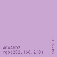 Цвет #CAA6D2 в цветовой модели RGB обозначается тремя октетами (202, 166, 210) в десятичном формате и #CAA6D2 в шестнадцатиричном (hex) формате, которые являются интенсивностью красного 202 (hex CA), интенсивность зелёного 166 (hex A6) и интенсивность синего 210 (hex D2).