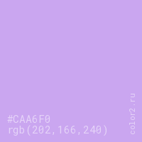 Цвет #CAA6F0 в цветовой модели RGB обозначается тремя октетами (202, 166, 240) в десятичном формате и #CAA6F0 в шестнадцатиричном (hex) формате, которые являются интенсивностью красного 202 (hex CA), интенсивность зелёного 166 (hex A6) и интенсивность синего 240 (hex F0).