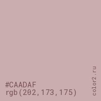 Цвет #CAADAF в цветовой модели RGB обозначается тремя октетами (202, 173, 175) в десятичном формате и #CAADAF в шестнадцатиричном (hex) формате, которые являются интенсивностью красного 202 (hex CA), интенсивность зелёного 173 (hex AD) и интенсивность синего 175 (hex AF).