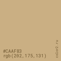 Цвет #CAAF83 в цветовой модели RGB обозначается тремя октетами (202, 175, 131) в десятичном формате и #CAAF83 в шестнадцатиричном (hex) формате, которые являются интенсивностью красного 202 (hex CA), интенсивность зелёного 175 (hex AF) и интенсивность синего 131 (hex 83).