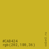 Цвет #CAB424 в цветовой модели RGB обозначается тремя октетами (202, 180, 36) в десятичном формате и #CAB424 в шестнадцатиричном (hex) формате, которые являются интенсивностью красного 202 (hex CA), интенсивность зелёного 180 (hex B4) и интенсивность синего 36 (hex 24).