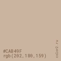 Цвет #CAB49F в цветовой модели RGB обозначается тремя октетами (202, 180, 159) в десятичном формате и #CAB49F в шестнадцатиричном (hex) формате, которые являются интенсивностью красного 202 (hex CA), интенсивность зелёного 180 (hex B4) и интенсивность синего 159 (hex 9F).