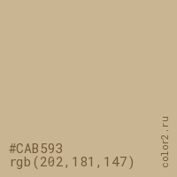 Цвет #CAB593 в цветовой модели RGB обозначается тремя октетами (202, 181, 147) в десятичном формате и #CAB593 в шестнадцатиричном (hex) формате, которые являются интенсивностью красного 202 (hex CA), интенсивность зелёного 181 (hex B5) и интенсивность синего 147 (hex 93).