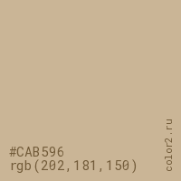 Цвет #CAB596 в цветовой модели RGB обозначается тремя октетами (202, 181, 150) в десятичном формате и #CAB596 в шестнадцатиричном (hex) формате, которые являются интенсивностью красного 202 (hex CA), интенсивность зелёного 181 (hex B5) и интенсивность синего 150 (hex 96).
