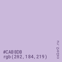 Цвет #CAB8DB в цветовой модели RGB обозначается тремя октетами (202, 184, 219) в десятичном формате и #CAB8DB в шестнадцатиричном (hex) формате, которые являются интенсивностью красного 202 (hex CA), интенсивность зелёного 184 (hex B8) и интенсивность синего 219 (hex DB).